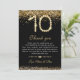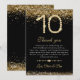 Celebre una década de amor y compromiso con esta elegante tarjeta de agradecimiento por el 10º aniversario de boda. Con un dramático fondo negro combinado con un diseño de "10" de diamante dorado de lujo, esta tarjeta captura la belleza atemporal y el brillo de un aniversario de diamantes. La refinada paleta de colores negro y dorado añade un toque de sofisticación, lo que la convierte en la forma perfecta de expresar gratitud después de su celebración de este hito.