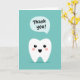 Tarjeta de agradecimiento dental que puede ser utilizada para agradecer a su dentista o a cualquier persona que trabaje con salud oral. La tarjeta presenta un diente pequeño blanco y feliz con una burbuja de diálogo que dice "Gracias" sobre un fondo azul turquesa. Texto personalizable en el interior: ¡Gracias por mantener nuestros dientes sanos!