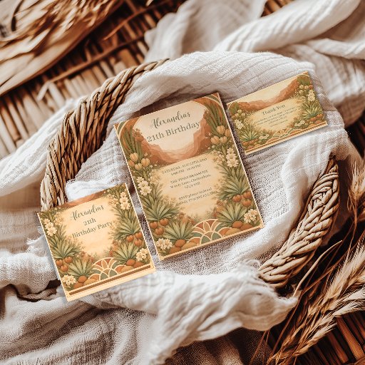 A soft, sun-washed desert birthday design featuring hand-painted wildflowers, gentle hills, and a warm neutral palette. The illustration has an elegant, vintage-inspired feel that works beautifully for milestone birthdays, garden celebrations, or relaxed outdoor gatherings. Fully customizable with your event details for a refined yet effortless look.