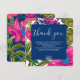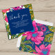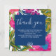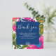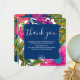Esta tarjeta de agradecimiento de despedida de soltera floral y botánica presenta flores de acuarela en colores rosa, púrpura y melocotón y hojas en tonos brillantes de verde con rosa intenso en el fondo. Una invitación de boda floral colorida perfecta