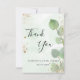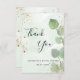 Una tarjeta de agradecimiento para Despedida de soltera. Un fondo verde acuarelado decorado con follaje de eucalipto y polvo dorado falso. En la parte delantera, un texto manuscrito en negro y el texto: Gracias, su texto, título y una fecha.