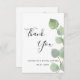 Una tarjeta de agradecimiento para una despedida de soltera. Un fondo blanco chic decorado con vegetación de eucalipto. En la parte delantera, un gran texto manuscrito en negro y el texto: Gracias, tú y una fecha. Reverso: Personaliza y agrega tu nota de agradecimiento y nombre.
