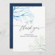 Tarjeta de agradecimiento para despedida de soltera con tema de océano azul marino y blanco de moda con helechos marinos, algas y estrellas de mar diseñada para ser personalizada rápida y fácilmente según los detalles de su evento.