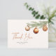 Tarjeta de agradecimiento minimalista y neutral para despedida de soltera con rama de pino pintada a la acuarela decorada con adornos de bola de Navidad.