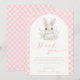 Expresa tu gratitud con un toque de encanto rústico y dulzura caprichosa. Esta hermosa tarjeta de agradecimiento presenta una encantadora ilustración de un conejito bebé entre delicadas flores, enmarcado por un suave diseño arqueado. Los tonos crema y rosa le dan un toque suave y femenino, perfecto para agradecer a los invitados que celebraron a tu "pequeño conejito en camino".