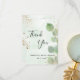 Una tarjeta de agradecimiento de ducha de novia. Un fondo de acuarela verde decorado con follaje de eucalipto y polvo de brillo dorado falso. En la parte delantera, una gran letra manuscrita de color negro y el texto: Gracias, su texto, título y una fecha.