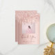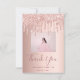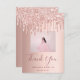 Una tarjeta de agradecimiento por un dulce 16, 16 cumpleaños. Un color de fondo rosa de color falso dorado metálico. Con rosas de purpurinas de imitación de oro gotean, pintura goteando. En el frente, gran guión de color rosa oscuro con letras de color oro y el texto: Gracias, tu texto, título y una fecha. Personaliza y agrega tu propia foto. Parte posterior: Plantillas para su nota de agradecimiento y nombre.