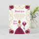 Esta tarjeta de agradecimiento de cumpleaños sweet sixteen presenta un elegante marco dorado, una hermosa princesa con cabello rojo y un vestido rojo borgoña, flores y un globo.