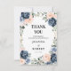 Tarjeta de agradecimiento de boda floral geométrica de dusty blue que presenta elegantes ramos de azul marino / dusty blue, blanco, rosa desvanecido, rosa melocotón y hojas de eucalipto verde salvia y elegante marco geométrico neutral con brillo. Por favor, contácteme para cualquier ayuda en la personalización o si necesita cualquier otro producto con este diseño.