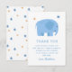 Una dulce manera de mostrar gratitud! Esta tarjeta de agradecimiento de elefante azul es perfecta para pequeños cumpleaños, fiestas de safari y celebraciones temáticas de la selva. La encantadora ilustración del elefante y el diseño simple y moderno hacen que sea fácil para su hijo enviar un sincero agradecimiento a los invitados. Es una forma encantadora de terminar la fiesta con una nota alegre, especialmente linda para cumpleaños de bebés niños, fiestas de niños pequeños o cualquier evento temático de animales adorables.