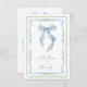 Chic and whimsical bridal shower thank you card featuring a vintage grandmillenial-inspired green scallop and blue floral watercolor frame, an elegant blue bow, and "with love + thanks" showcased in a blue calligraphy script. On the back, personalize your thank you message in simple modern lettering and add your name in a signature-like script, or leave blank for handwritten notes.