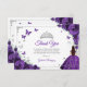 Purple silver and white Quinceanera thank you card. Features brunette girl in ball gown dress, script font, silver butterflies, purple roses and tiara. Perfect for an elegant princess style glam celebration. Personalize with your own details.