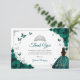 Emerald green silver and white Quinceanera thank you card. Features brunette girl in ball gown dress, script font, silver butterflies, dark green roses and tiara. Perfect for an elegant princess style glam celebration. Personalize with your own details.