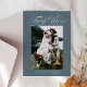 Modern and elegant wedding thank you card featuring a script text with swashes and dots that says "thank you" on the top. The background is slate blue.