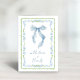 Tarjeta de agradecimiento plegada elegante y caprichosa para despedida de soltera con un marco de aquarela floral azul y verde con volantes pintado a mano, un lazo azul caprichoso y "con amor + gracias" mostrado en una caligrafía azul. En el interior, personalice su mensaje de agradecimiento con letra moderna simple y agregue su nombre en una caligrafía similar a una firma, o déjelo en blanco para notas manuscritas.