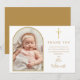 Un elegante arco dorado y una foto de bautizo o comunión con letra de firma, tarjeta de agradecimiento. Personalice con su foto especial y mensaje de agradecimiento en elegante letra dorada. Diseñado por Thisisnotme©