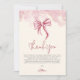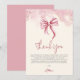 Tarjeta de agradecimiento minimalista y elegante para lluvia de boda con lazo rosa y tipografía manuscrita sobre fondo amarillo crema con elementos de acuarela. Ilustrado y diseñado por Patricia Alvarez.