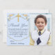 Gracias a tus amigos y familia por asistir a la primera comunión de tu hijo o darle un regalo con esta elegante cruz de oro Primera Comunión, tarjeta de agradecimiento. Un fondo azul pálido da un tono elegante a la decoración de las esquinas superiores con ramos florales suaves de color azul y melocotón. Una cruz simple de oro honra el centro de la tarjeta de agradecimiento de la comunión de este niño. Personalice con el nombre de su hijo y una nota especial, así como una foto de su hijo.