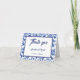 Una tarjeta de agradecimiento boda con un elegante diseño de mosaico floral azul y blanco.