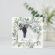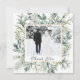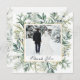 Boda fotográfico de invierno Gracias tarjeta representa una elegante vegetación acuática que incluye pino, eucalipto, bayas azules y verduras alrededor de un marco dorado y fotografía. El mensaje se puede personalizar o borrar para una nota escrita a mano. Buena elección para bodas de invierno y Navidades de temporada.