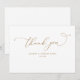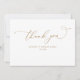 Expresa tu gratitud con estilo con esta elegante tarjeta de agradecimiento de boda dorada con letra de caligrafía. Con una hermosa y fluida caligrafía dorada, este diseño emana sofisticación y encanto. La delicada letra transmite bellamente tu sincero agradecimiento, lo que la convierte en la forma perfecta de expresar aprecio a tus invitados. Ideal para una celebración de boda atemporal, esta tarjeta de agradecimiento añade un toque refinado a tu correspondencia posterior a la boda, dejando una impresión duradera con cada nota que envíes.