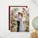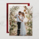 Diseño elegante y sencillo con plantilla de fotografía vertical con secuencia de comandos de caligrafía "Gracias" (el color se puede personalizar utilizando el selector de color) y campos de texto editables. En la parte posterior se muestra un escudo floral de oro dibujado a mano con campos de texto para su monograma, adornado con un pulverizador colorido de flores y follaje de Navidades rojos, blancos y verdes. Incluye un campo de texto adicional que se puede eliminar para su mensaje personal escrito a mano.