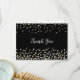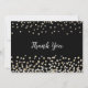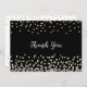 Elegante diseño de fiesta de graduación personalizado con confeti dorado y plateado sobre fondo negro y escritura moderna con las palabras "Gracias" (en plata). Personalízalo con tu mensaje de agradecimiento y cerrando en la parte posterior de la tarjeta.