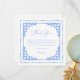 La tarjeta de agradecimiento para la ducha de novia con azulejos azules y blancos rezuma elegancia con su mezcla de elementos de diseño modernos y encanto mediterráneo. Los patrones de azulejos pintados a mano adornan los bordes, creando un marco cautivador para los detalles del evento. Los delicados acentos de acuarela evocan una sensación de tranquilidad y belleza, estableciendo el tono perfecto para una celebración inolvidable.
