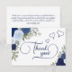 Agradece a los invitados de tu despedida de soltera con estas hermosas y atentas tarjetas. El diseño presenta una abundancia de rosas pintadas a mano en acuarela en tonos de azul polvoriento, azul marino, zafiro e índigo junto con follaje de jardín y eucalipto. La parte frontal de la tarjeta dice Gracias en elegante letra de imprenta moderna con florituras y floreos, y hay tres corazones lindos y románticos. La parte trasera tiene espacio para una nota personalizada y tu firma. Hermosa forma de expresar tu gratitud mientras tú y tus amigas esperan con ansias el día de tu boda.