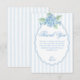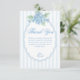 Un diseño granmillennial clásico y elegante inspirado en la antigüedad con estética de jardín inglés victoriano. Delicadas hortensias azules en acuarela y encantadoras flores de nomeolvides están dispuestas sobre rayas azules suaves y elegantes con un marco ovalado de volantes dibujado a mano.