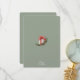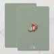 Un diseño elegante y clásico de Navidades en un sofisticado fondo verde sabio. El ilustracion, de estilo acuático, cuenta con una caja de regalo blanca atada con una cinta roja vibrante, rodeada por una corona festiva de agujas de pino, piñones y bayas huecas.