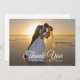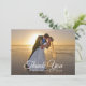 Gracias a sus invitados por ayudarle a celebrar su día especial con este diseño simplemente elegante que incluye su foto con escritura moderna, gris carbón vegetal y cobre de oro rosa junto con una palmera artística de cobre de oro rosa. Personalizar con tu foto, nombres y fecha de boda en el frente junto con tu mensaje y nombres en la parte de atrás.