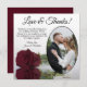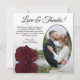 Estas hermosas tarjetas de agradecimiento boda son una manera maravillosa de mostrar su aprecio a sus amigos y familia por celebrar con usted en su día especial. Presentan la foto de su boda en un marco ovalado con un solo rosa de color burdeos, marrón o rojo vitivinícola de tallo largo sobre su lado reflejando en el agua. El título dice "Amor y Gracias" con espacio para una nota y firma personalizado. Clásicas, románticas y sofisticadas, estas tarjetas son la manera perfecta de concluir su celebración boda.