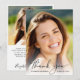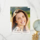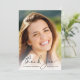 Tarjeta de agradecimiento de graduación elegante que presenta la foto del graduado superpuesta con "gracias" en una letra elegante y su nombre, escuela y año de graduación en tipografía simple. En el reverso, agregue una foto adicional, personalice un mensaje de agradecimiento y agregue el nombre del graduado en una letra similar a una firma.