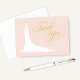 Tarjetas elegantes de agradecimiento para la ducha de novia o boda para la novia con estilo que presentan una fuente de escritura de caligrafía ornamentada y un vestido de novia fluido. Los detalles de florituras, flores y mariposas acentúan el vestido etéreo. El formato de tarjeta plegada incluye espacio en el interior para un mensaje manuscrito. Los colores del diseño incluyen una paleta de tonos rosa pálido, blanco y dorado
