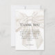 Envíe una sincera nota de gratitud con nuestra tarjeta de agradecimiento por el tema elegante y simple de Bow. Diseñada para coincidir con el tema de la ducha de novia "She's Tying the Knot", esta tarjeta presenta un refinado detalle de arco que simboliza el amor, la unidad y el hermoso vínculo por venir. Con sus líneas depuradas y su encanto atemporal, es la manera perfecta de agradecer a los huéspedes su amor, regalos y apoyo mientras se prepara para caminar por el pasillo. Ideal para duchas de novias, fiestas de compromiso, o cualquier celebración pre-boda donde quieras expresar tu sincero agradecimiento, con un toque de elegancia.