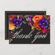 Abraza la belleza opulenta de una cosecha floral de otoño con nuestra cautivadora tarjeta de agradecimiento para una despedida de soltera. Un fondo negro dramático y suave proporciona el lienzo perfecto para un ramo de flores increíblemente realista. Imagina una explosión vibrante de color, con rosas en naranja y magenta oscuro, junto con pequeñas flores rosadas magenta y violetas púrpuras y junto a crisantemos melocotón y otras flores vibrantes. El follaje oscuro y exuberante completa el arreglo, agregando un toque de elegancia natural. Este diseño cautivador es perfecto para cualquier temporada, reflejando la intensidad apasionada de tu historia de amor. Tu mensaje de agradecimiento se muestra en elegante letra cursiva, asegurándose de que se destaque hermosamente contra el dramático fondo. Este diseño encantador crea una invitación verdaderamente inolvidable para celebrar tu día especial. Creado por Simply