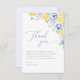 Una tarjeta de agradecimiento fresca y elegante que presenta suaves limones de acuarela, flores azules polvorientas y caligrafía elegante. Perfecta para agradecer a los invitados después de una boda inspirada en el verano o en el Mediterráneo. Fondo blanco limpio para una apariencia atemporal y refinada.