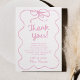 ¡Esta es una tarjeta de agradecimiento para la Despedida de soltera con un lazo caprichoso dibujado a mano de color blanco y rosa!