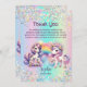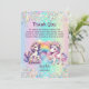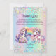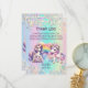 Muéstrate tu gratitud con esta encantadora carta de agradecimiento con temática unicornio! Con dos adorables unicornios, un arco iris y brillantes acentos, esta tarjeta es la manera perfecta de agradecer a los invitados que hicieron mágico el cumpleaños de su hijo. Personalízalo con el nombre de su hijo y la fecha de su fiesta para un mantenimiento atento y memorable. Los colores pastel y el diseño caprichoso crean una hermosa manera de expresar tu aprecio por los recuerdos compartidos y los tiempos de diversión.