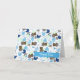 Una tarjeta de agradecimiento a un niño con un patrón que consiste en osos, fardos, pasadores de pañales, coches de bebé y "¡Es un niño!" con un esquema de color azul.