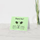 Esta tarjeta de agradecimiento tiene la cara de un gato ilustrado en negro con ojos verdes brillantes y bigotes largos sobre un fondo verde claro.
