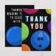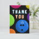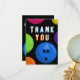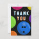 Tarjeta de agradecimiento negra y de neón diseñada para fiestas de cumpleaños de bolos para niños, pero que se puede utilizar para otros eventos con tema de bolos (por ejemplo, eventos corporativos de bolos, recaudaciones de fondos de bolos, reuniones familiares de bolos).