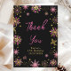 Esta elegante y glamurosa tarjeta de agradecimiento de fiesta de cumpleaños cuenta con copos de nieve rosados y dorados con brillo falso en acuarela y destellos en un fondo negro. El texto combina una fuente manuscrita con tipografías modernas sans serif para un aspecto clásico y sofisticado. Esto es perfecto para una fiesta de cumpleaños de invierno o Navidad. Gráficos por www.etsy.com/uk/shop/SunflowerDayLove