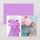 Tarjeta divertida y linda de agradecimiento de cumpleaños para la fiesta temática de dinosaurios de su hijo. Ilustración estilo caricatura de un dinosaurio rosa. El t rex lleva un pequeño sombrero de fiesta de princesa rosa. Sobre el t-rex dice "Gracias por pasar". En el cuerpo del dinosaurio hay un mensaje que agradece al invitado por venir y por los regalos. Agregue el nombre de su hijo al final. El texto es fácilmente editable en línea. Puede personalizar aún más este producto agregando la foto de su hijo.