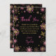 Esta elegante y glamurosa tarjeta de agradecimiento para fiesta de cumpleaños cuenta con copos de nieve y destellos de purpurina rosa y dorada en un fondo negro. El texto combina una tipografía manuscrita y fuentes modernas sans serif para un look clásico y sofisticado. Esto es perfecto para una fiesta de cumpleaños de invierno o Navidad.