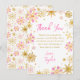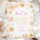 Esta elegante y glamurosa tarjeta de agradecimiento para fiesta de cumpleaños cuenta con copos de nieve con brillo falso rosa y dorado pintados a la acuarela y destellos en un fondo blanco. El texto combina letra manuscrita y tipografías modernas sans serif para un look clásico y sofisticado. Esto es perfecto para una fiesta de cumpleaños de invierno o Navidad.