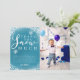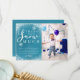 Tarjeta de agradecimiento de cumpleaños con tema de nieve de invierno lindo en azul turquesa con nieve y copos de nieve blancos brillantes con un texto de tipografía que dice "gracias nieve mucha". El mensaje editable agradece a los invitados por venir a la fiesta y por el regalo. El fondo es azul. Ideal para el primer cumpleaños de un niño en la temporada de Navidad. Agrega la foto de tu hijo junto al mensaje.