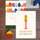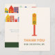 Tema de fiesta de cumpleaños del barrio con ilustración en la parte delantera de la luz de tráfico con texto "gracias por pasar". La parte trasera presenta casas y edificios con mensaje de agradecimiento.