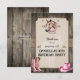 Ensíllate y galopa hacia una divertida fiesta de cumpleaños con tema de paseo a caballo. Un fondo de tablones de madera sugiere el interior de un establo con un panel sujeto por correas de arpillera. El panel de color crema tiene una marca de agua de caballo. En la parte superior, un caballo se asoma a través de una herradura para agradecer a los invitados por participar en un día divertido con caballos. Un par de botas rosas y un sombrero de vaquero están colocados hacia la parte inferior de la tarjeta con adornos de estilo western que acentúan el diseño. Disponible con productos coincidentes.